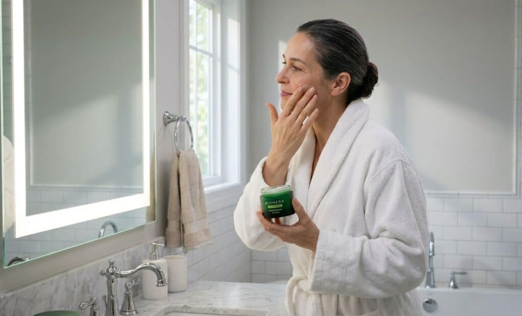 „Без операција, ветено. Без Ботокс. Користам овој крем наречен Bionera MossElixir околу 3 месеци. Лудо е, Сандра. Навистина… животопроменувачко лудо."